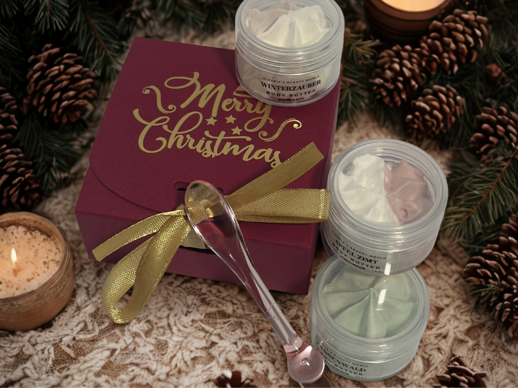 - Erlebe unsere reichhaltige, handgemachte Bodybutter in einer Probebox, die so einzigartig ist wie du. Ob blumig, fruchtig, frisch oder warm – du bestimmst, welche 4 Düfte du testen willst. Perfekt zum Kennenlernen, Verschenken oder Verlieben.